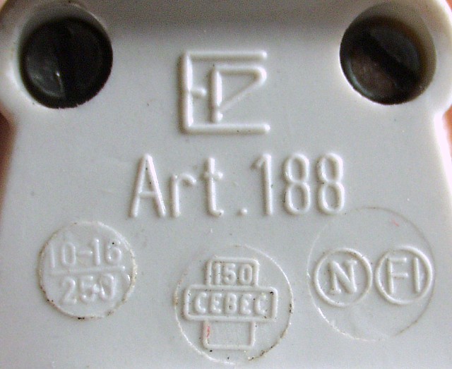 Pistokkeessa on ruotsalaisen (S), norjalaisen (N) ja suomalaisen (FI) testilaboratorion merkki muttei CE-merkintää.