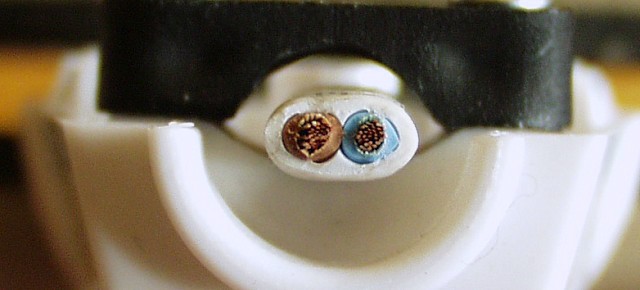 Alla näkyy 3 x 1,5 mm^2 suojamaadoitettu johto ja voidaan huomata, että vedonpoistosilta istuu siihen erinomaisesti.